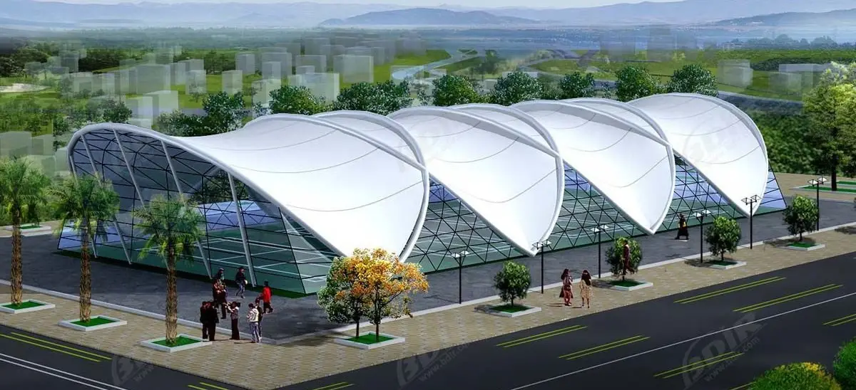 Desain modern melengkung, anti-UV & waterproof. Struktur pipa/baja finishing powder coating.